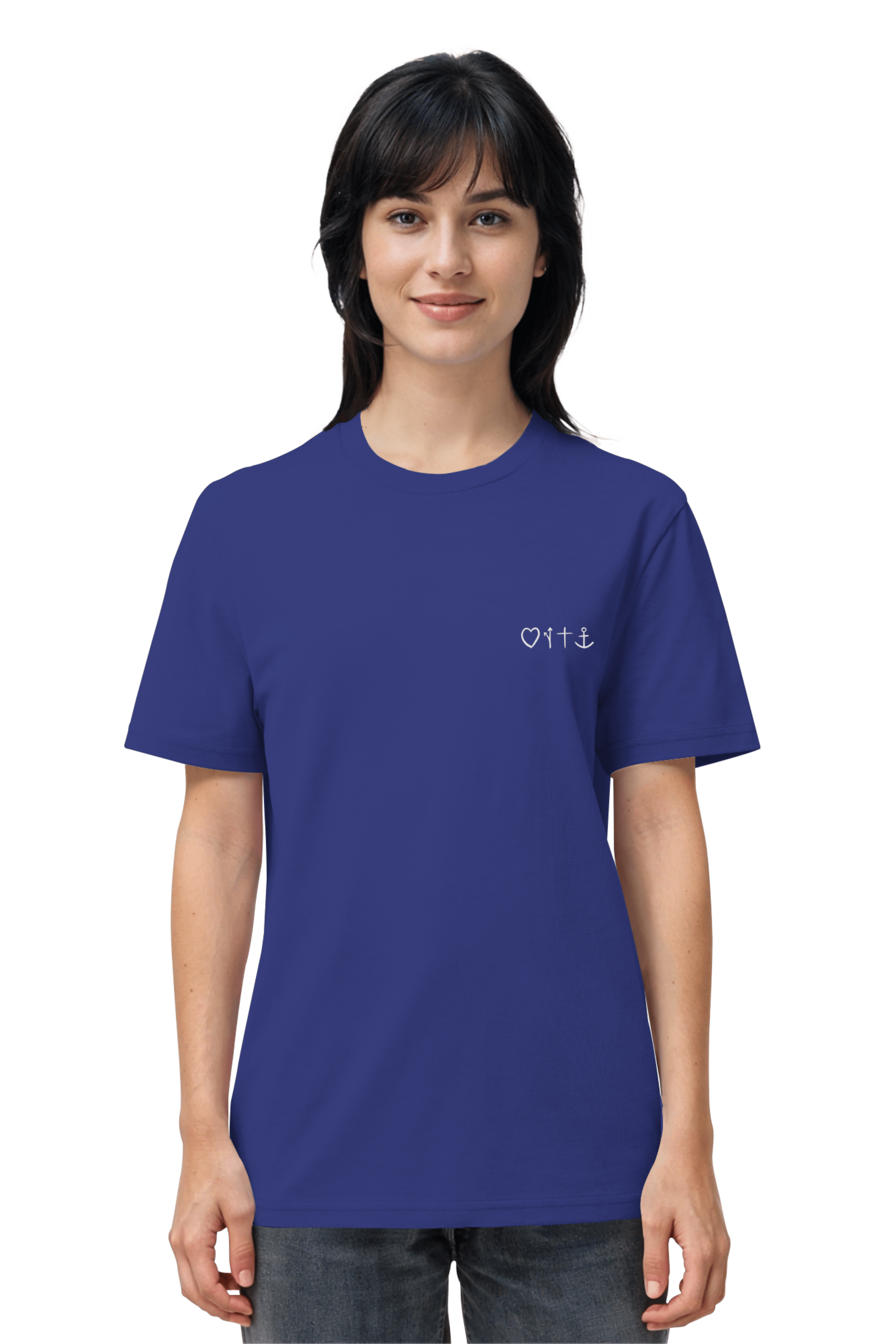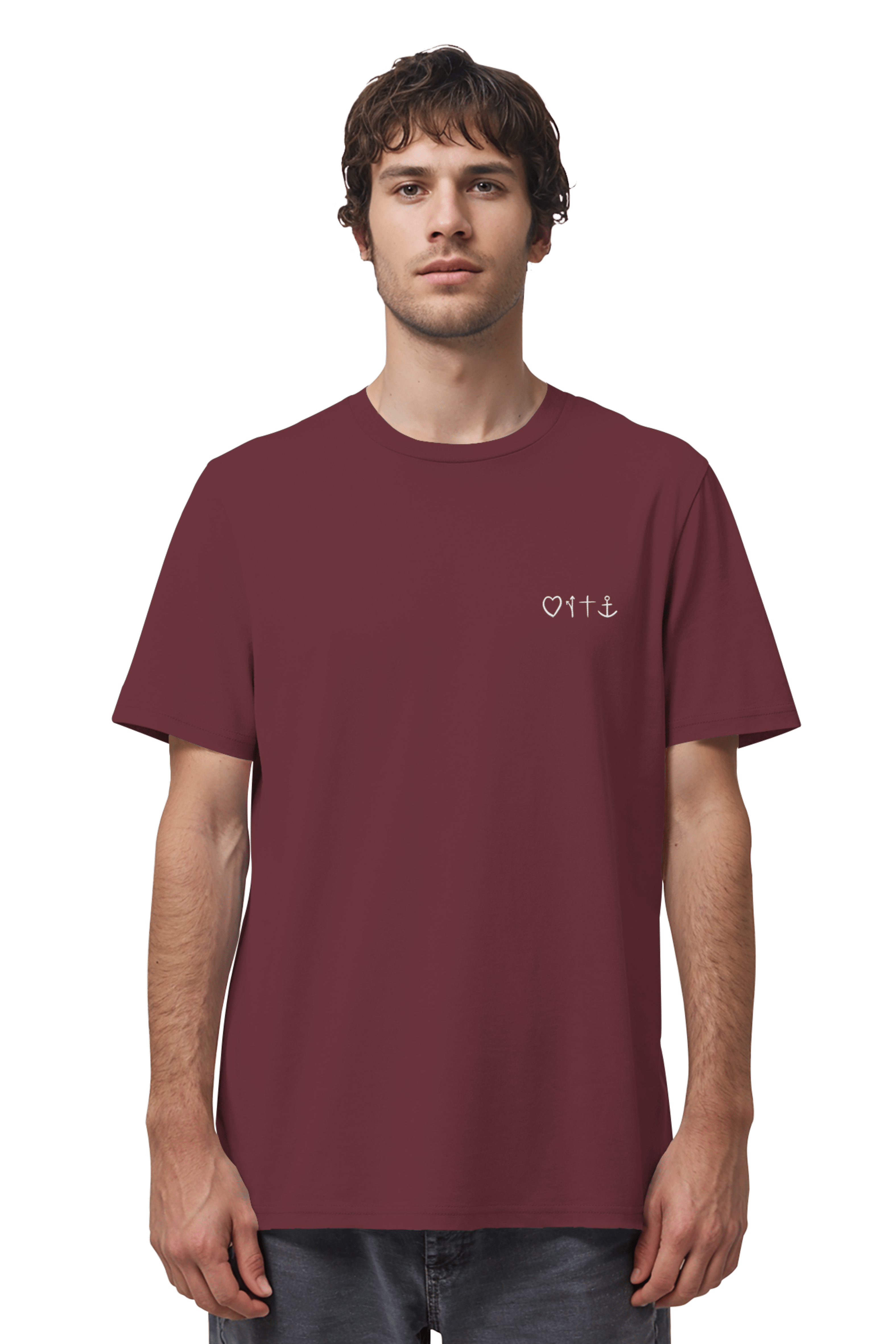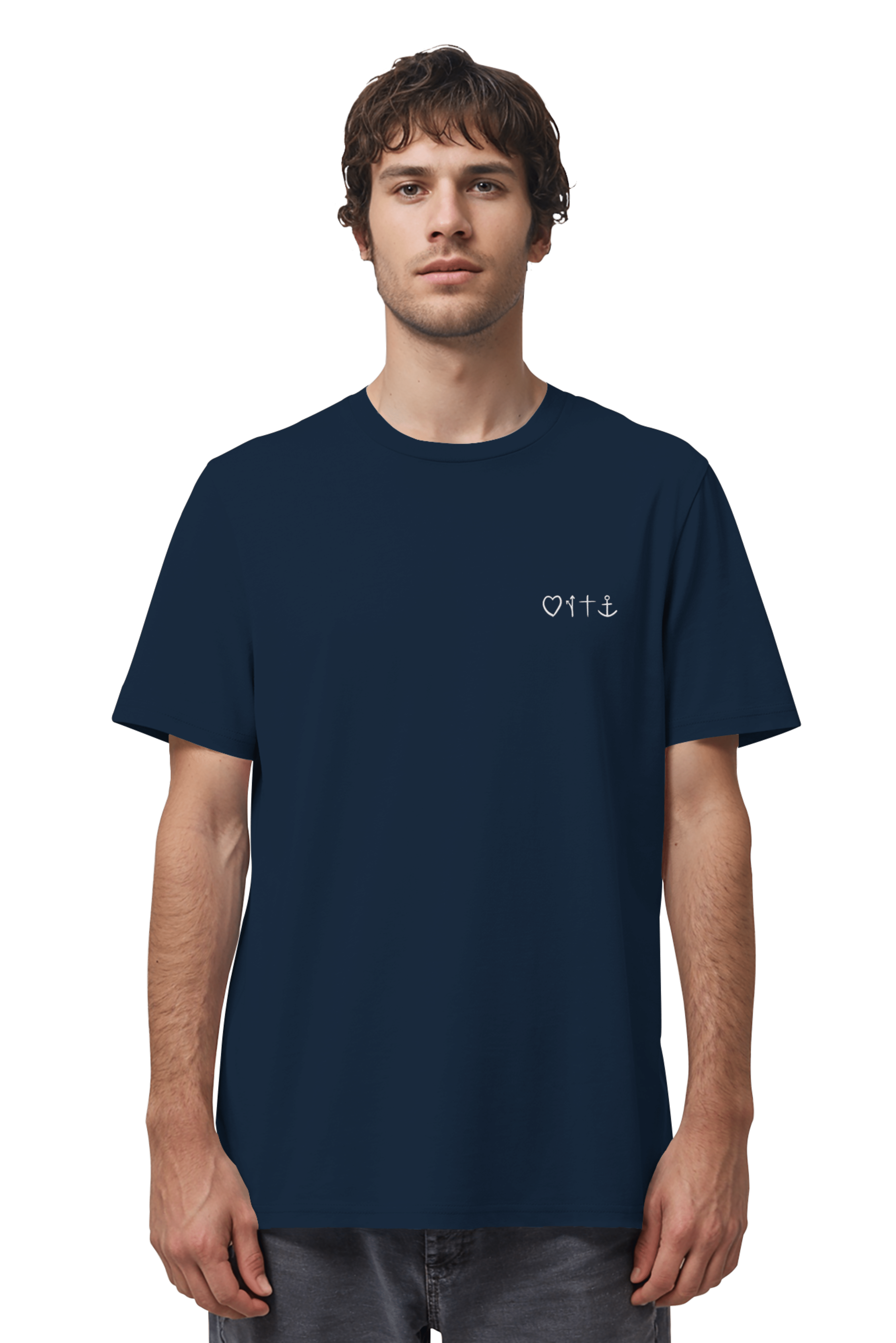 Diese vier Symbole spiegeln die frohe Botschaft wider: die Botschaft der Vergebung von Sünde durch Jesus. Jedes Symbol erzählt einen Teil dieser Geschichte. Das Herz steht für unsere Berufung als Menschen: Gott, uns selbst und unsere Mitmenschen zu lieben. Wir alle wissen, wie oft wir dieses Ziel verfehlen oder es nur unvollkommen umsetzen. Die Weggabelung symbolisiert unsere Verfehlungen, die uns von Gott und unserer eigentlichen Berufung trennen. Weil wir es nicht aus eigener Kraft schaffen, bedingungslos zu lieben, ist Jesus auf die Welt gekommen. Das Kreuz zeigt, dass Jesus für unsere Sünden gestorben ist und dass uns alle Verfehlungen vergeben sind. Schließlich steht der Anker für das Leben voller Frieden und Hoffnung, das uns durch die Entscheidung für Jesus offensteht. Dieses Shirt lädt dazu ein, die Botschaft von Liebe, Vergebung und Hoffnung zu leben, die Christus uns geschenkt hat, und im Glauben verankert zu bleiben.